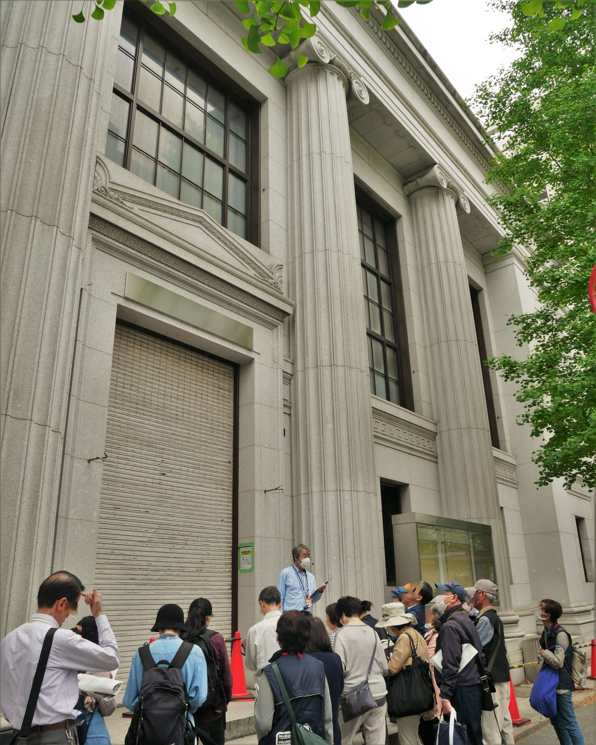 旧横浜正金銀行本店本館(神奈川県立歴史博物館)、旧三井銀行横浜支店(三井住友銀行横浜支店)、神奈川県庁本庁舎、旧新港埠頭第一号・第二号倉庫(横浜赤レンガ倉庫1号館・2号館)、旧臨港線護岸(汽車道)、旧横浜船渠株式会社二号船渠(ドックヤードガーデン)を歩いて巡りながら、建築に使用されている石材を観察し、どこの産地の石材か、建造物の歴史はどのようなものだったか、丹治学芸部長が解説を行いました。