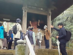 今回の見学会では、当館仏教美術担当の神野学芸員が、源頼朝も歩いたであろう参道からスタートし、仁王門、本堂、宝殿の様々な仏像を解説しました。