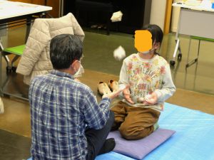 作った後は遊び方の解説動画を見ながら実際に投げて遊びました。昔ながらの遊びですが、自分で作ったお手玉はやはり特別です。案外普段しない動きをするので、お子さんも大人も楽しく参加いただけたようです。