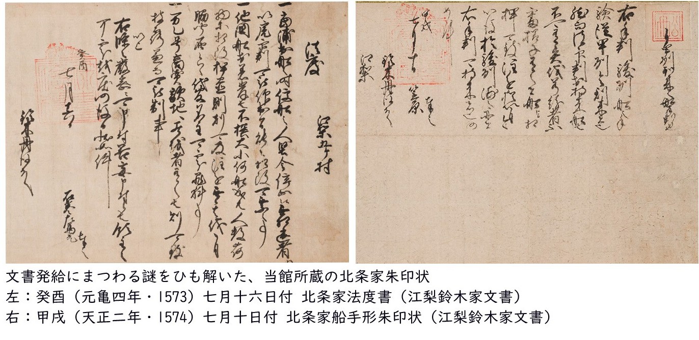 講演では、まず、そもそも北条家朱印状はどのような文書であるのか、その特徴や生まれた背景、および文書の様式(直状式、奉書式)について解説しました。それを受けて後半は、当館所蔵の2組6通の北条家朱印状を取り上げ、これらの朱印状の内容と様式について説明した後、これまでの評価と最新の研究成果を踏まえた文書発給にまつわる“謎”をひも解いていきました。
