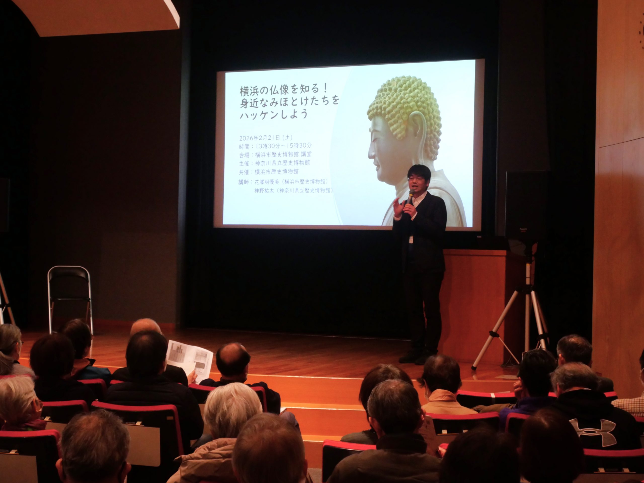 去る2月21日(土曜)に横浜市歴史博物館との連携講演会「横浜の仏像を知る!―身近なみほとけたちをハッケンしよう―」を行いました。講師は2人の彫刻担当学芸員、横浜市歴史博物館の花澤学芸員と当館の神野主任学芸員です。