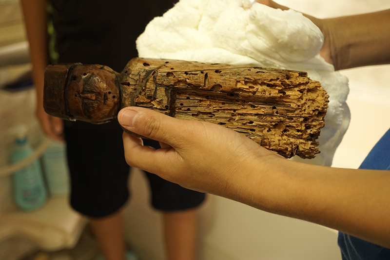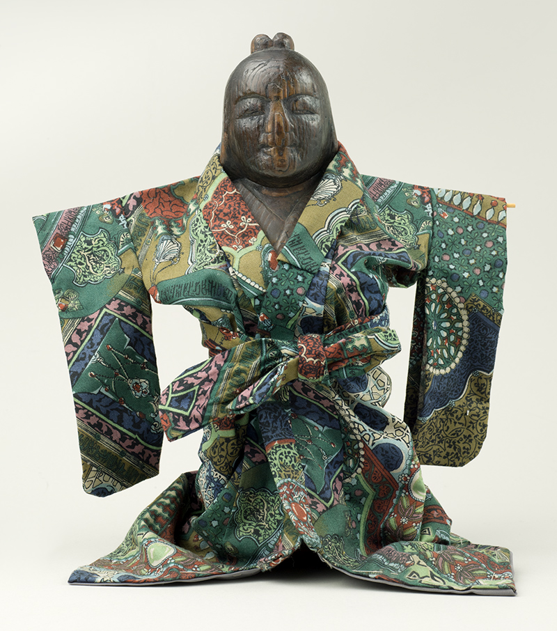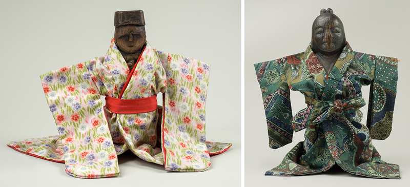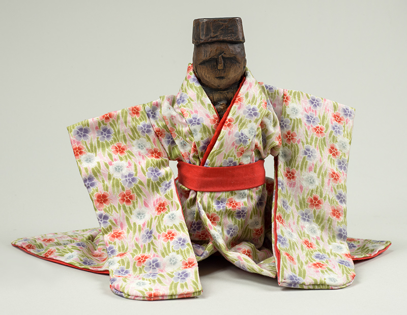 さて、谷戸地区と上地区には、子どもの守り神といわれているオミヒメサマ(オミシメサマ/オミシマサマ)という木像があり、セイトッコによってまつられています。谷戸地区のオミヒメサマ(21.0cm)は、頭部に冠のようなものを被っているようにもみえます(図4)。また、上地区のオミヒメサマ(30.0cm)の頭部は、伸ばした髪を結った総髪(そうはつ)のようにもみえます(図5)。両像は檜(ひのき)材で彫られた素朴な立像で、両手を胸の前で合わせ、着物を着せられています〈註2〉。