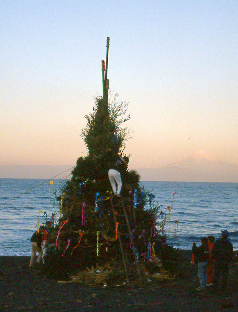 1月4日、セイトッコはリヤカーを曳いて地区内の正月飾りを集め、オンベをつくるために浜へ運びます。オンベとは正月飾りを円錐形に高く組み上げたものです。7日の早朝、セイトッコは「オンベ、コシテ、ケーヤッセ(オンベをこしらえてください)」と言いながら地区内をまわります。
