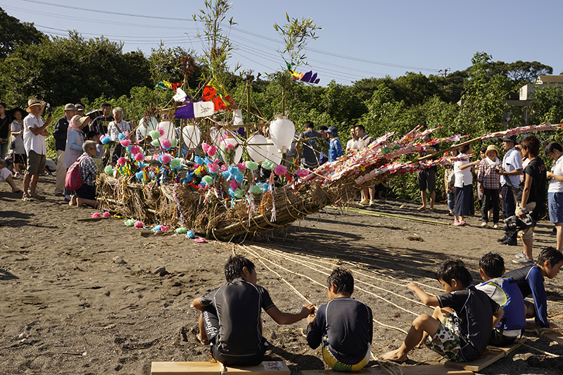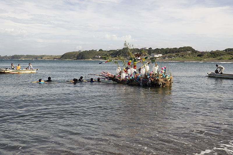 16日の早朝、セイトッコは地区内の寺の墓に供えられた供物を集めて浜に運びます。浜に到着するとセイトッコとその男親は藁と竹で5mほどのオショロブネ(お精霊舟)をつくり、セイトッコはヤドとする集会所で自作した花紙や紙テープで飾り付けをします。オショロブネが完成すると、船首に10mくらいの縄をつけ、縄の先端に板片を結びつけます。この板片はセイトッコが掴まるビート版のようなもので、これを頼りにオショロブネを沖合まで泳いで曳きます(図2・図3)。