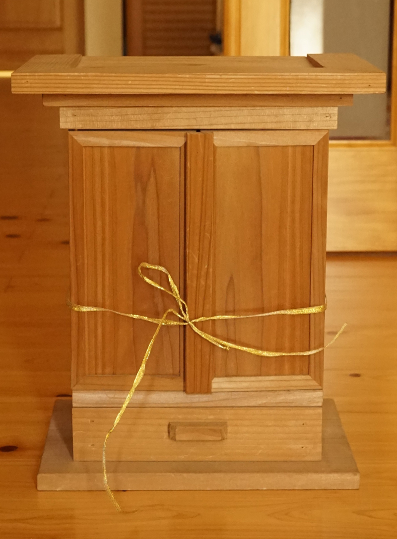 普段、オミヒメサマはヤドを務める個人宅にあります。谷戸地区では厨子に納められ、上地区では神棚にまつられています(図6)。セイトッコがオミヒメサマを実際に手に取ってまつるのは、前述の1月7日のオンベ焼きと8月の盆のオショロ流しの後です。タイショウはヤドを務める家に行き、そこでまつられているオミヒメサマをその家の風呂に入れ、新調の着物に着せ替えます(図7・図8)。以前はオミヒメサマが入ったお風呂に入ると病気にならないとか丈夫になるなどと言われており、セイトッコは後の湯に入っていました。