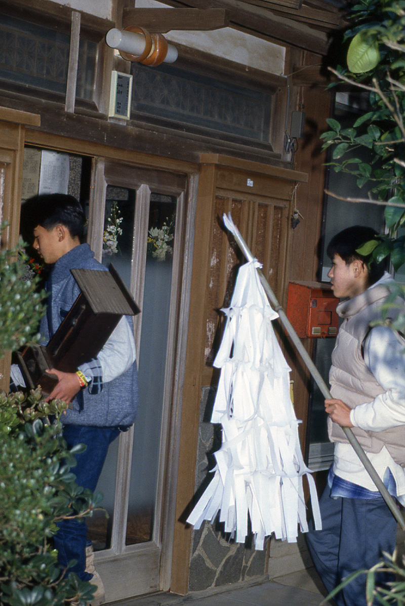 現在では正月と盆にオミヒメサマの入浴が行われていますが、これは元々は小正月の行事であったとされています〈註4〉。入浴が済むとセイトッコはオミヒメサマと幣束(へいそく)を持ち、「ユワッテケーヤッセ(祝ってください)」といって各戸をまわって賽銭をもらい歩きました(図9)。谷戸地区の男児が生まれた家では賽銭を多く出し、上地区では丈夫に育つようにと小児の額をオミヒメサマで擦ったり、子どもが欲しい嫁はセイトッコに頼んで特別にオミヒメサマを抱かせてもらったりしました。