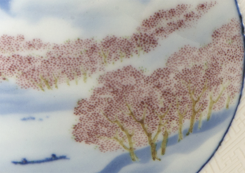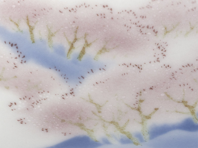 ちなみに、空や桜の花に用いられている淡いピンク色の釉下彩の顔料は正円子(しょうえんじ)といって、金が発色剤として用いられているので、非常に高価なものなのです。