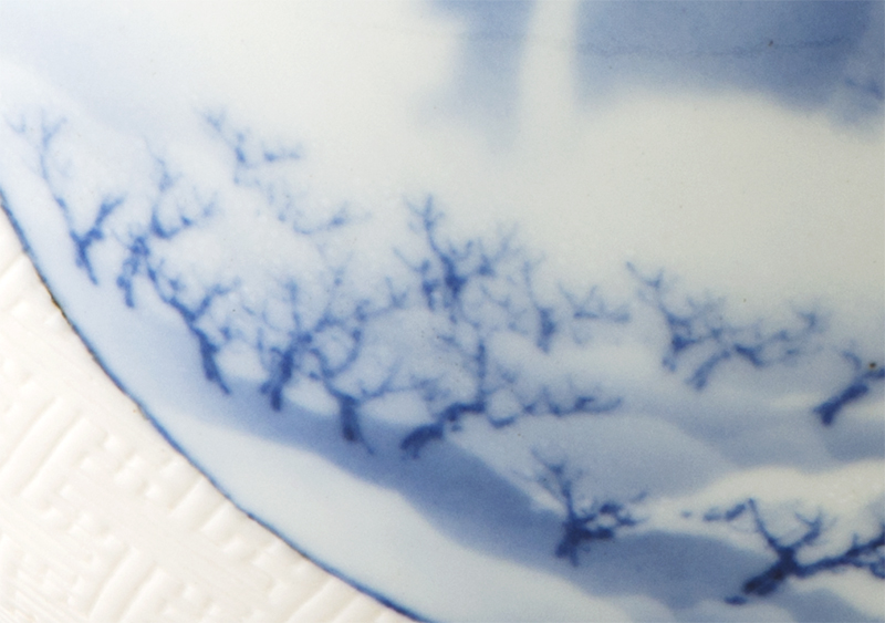 この「釉下彩」という技法は明治に入って西洋から新たな技術が入ってきて可能になった技術です。江戸時代以前の日本の陶磁器での主な色彩表現は、陶磁器を焼いた後にその上から絵付けをする「上絵付け」(=色絵、赤絵)が行われてきました。釉下彩というと主に染付や青花と呼ばれる青一色のみでした。この上絵具では表現できなかった様々な色での淡いグラデーションが釉下彩によって初めて表現できるようになりました。