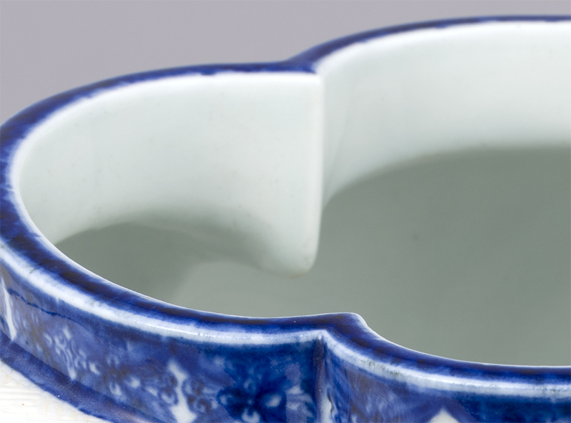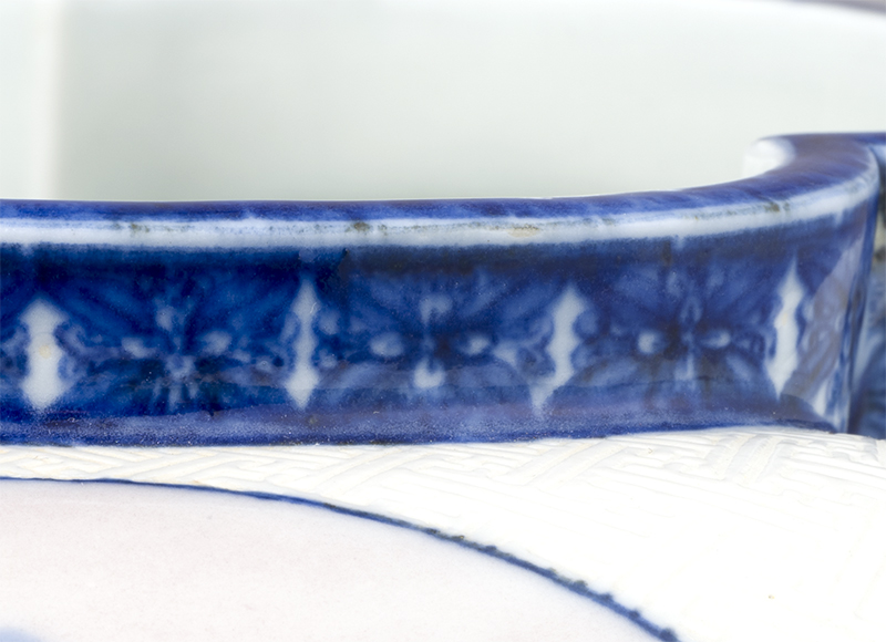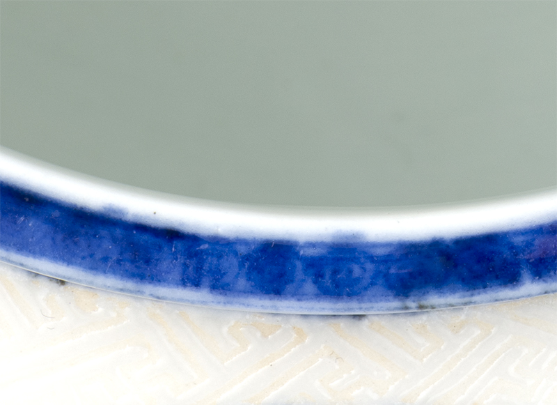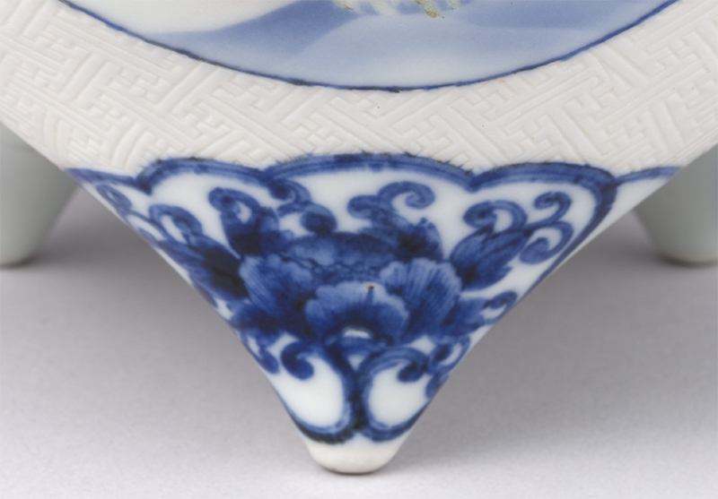 まず、深い藍色に発色した染付の文様について見ていきましょう。口の側面(図7)には七宝繋ぎと花を組み合わせたような文様、三つの足の外側(図8)には牡丹の文様が描かれています。さらに近くで見ても気が付きにくい部分ですが、真上からみると、口縁部には染付で一列に渦文様が描き込まれています(図9)。