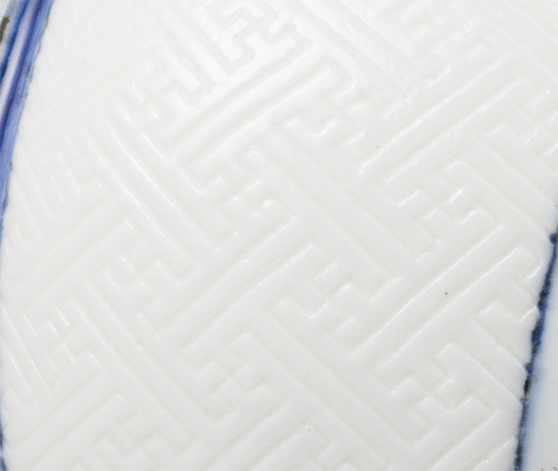次に、絵のまわりの白地の部分に注目します。拡大すると、白地に透明の釉薬によってびっしりと紗綾形(さやがた)文が描き込まれています(図10)。この文様の筋の一本の太さはわずか1mm程度です。釉(ゆう・うわぐすり)がかかっている部分はわずかに盛り上がっており、指でなぞるとぽこぽことしています。