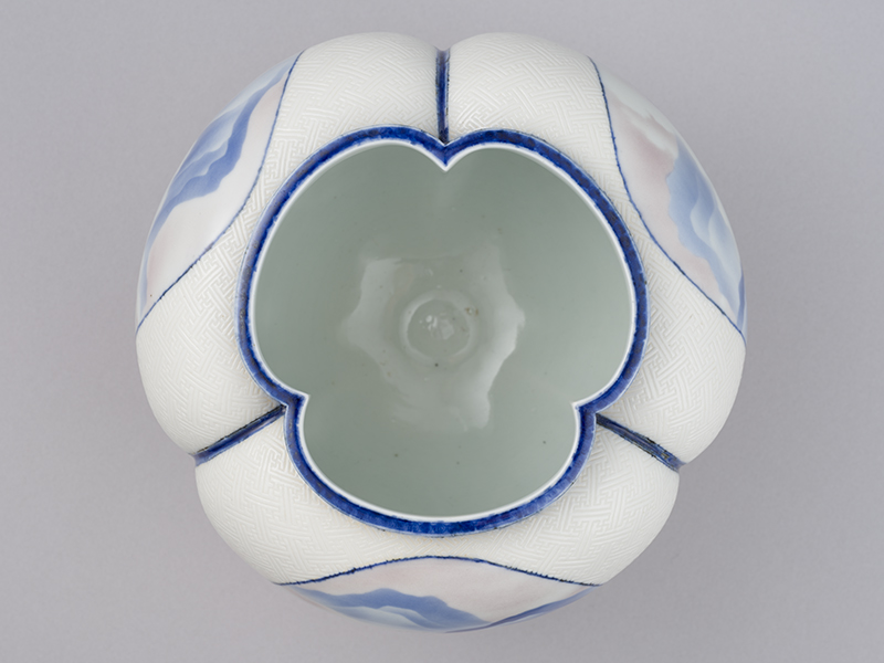 1作品の中に、釉下彩による淡いグラデーションの色彩、表面の凹凸した紗綾形文、三つのふくらみのある器形と、魅力の詰まった逸品です。
