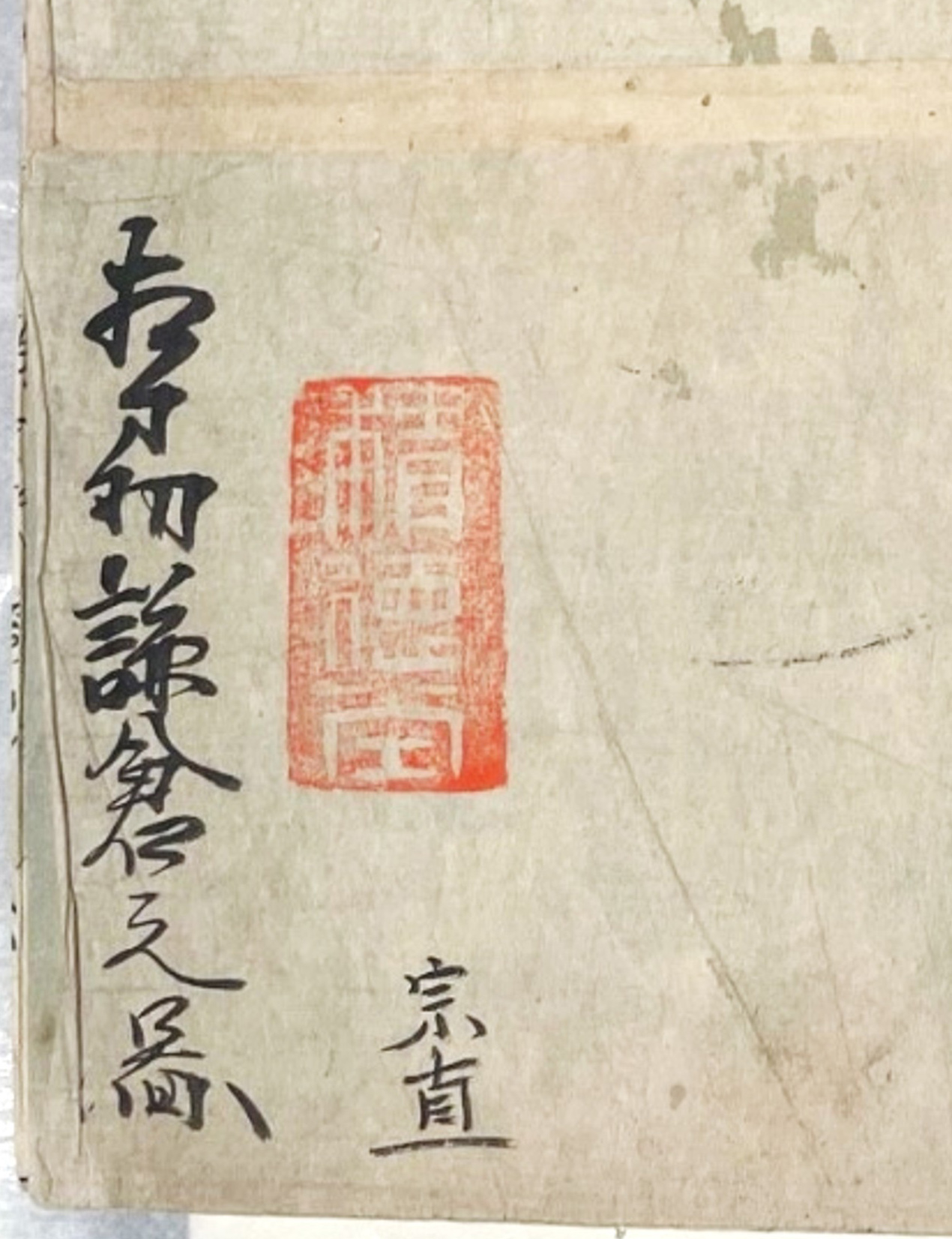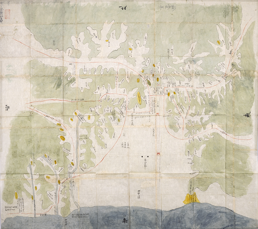 ふたつめの「相州鎌倉之図」(図2)は1m四方ほどもある肉筆彩色絵図です。裏面の「積徳堂(せきとくどう)」の朱印(図3)からもともとは兵学者・山鹿素行(やまがそこう)の創始した山鹿流兵学の積徳堂文庫に収まっていた図であることがわかりました。「相州謙(ママ)倉之図」の墨書の横に記された作者「宗直」の素性はわかっていませんが、国文学研究資料館所蔵の積徳堂文庫に残る資料から、延宝年間(1673~)に活動した人物であることがわかっています。近世兵学、特に山鹿流の原始である甲州流兵学においては、城郭の曲輪や構造を示す縄張図、各合戦の陣形を学ぶ合戦図など絵図作成とその添削が重要な教導のひとつでした。素行の師であり甲州流兵学の流れを汲んだ北条流兵術始祖の北条氏長(ほうじょううじなが)は、幕府大目付として正保国絵図再編を主導したことでも知られます。