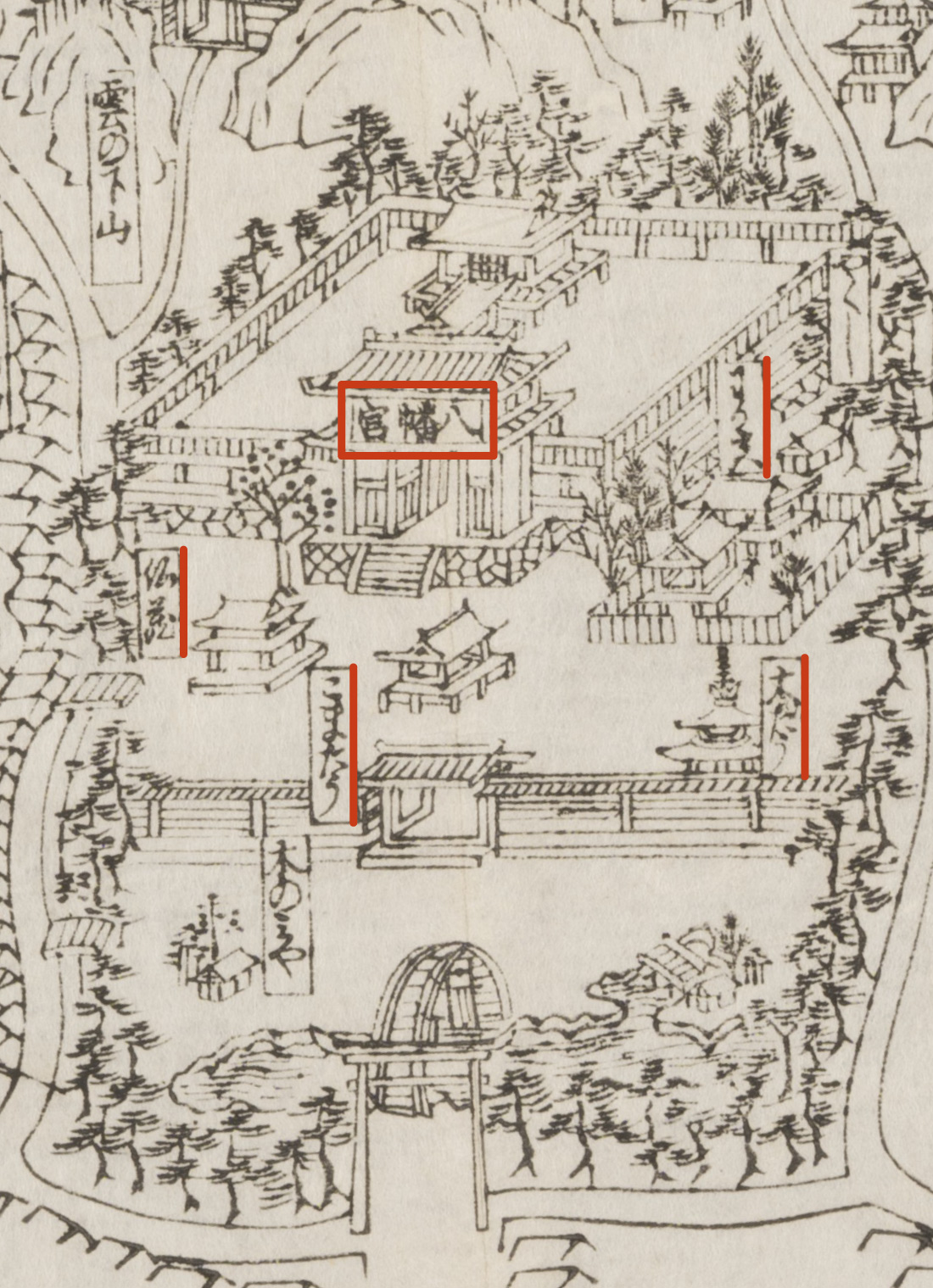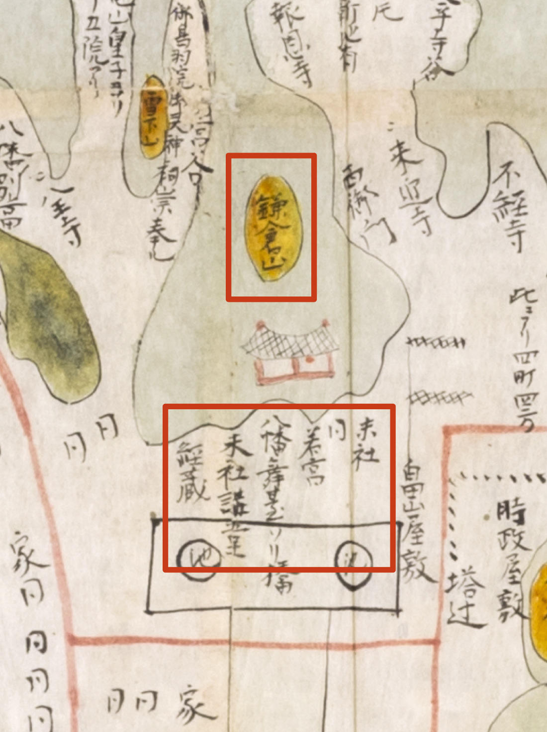 ふたつの図は、いずれも中央に鶴岡八幡宮を描きます。案内図である図1は本社よりも「八幡宮」の額がかかった楼門が目立ちますが、「若宮」「仏蔵(経堂のことか)」「こまたう(護摩堂)」「大たう(大塔、多宝塔か)」など諸建築をも立体的に示しています(図4)。一方図2は黄色の楕円内に「鎌倉山」と示された前に描かれた建物が八幡宮本社でしょうか(図5)。「経蔵/末社講堂/八幡舞台/若宮/同/末社」と諸社を文字で端的に示しており、細かな社殿の様子よりも山や谷といった地形・配置を重視している図であることがわかります。