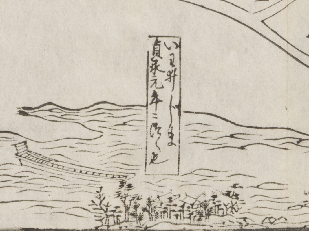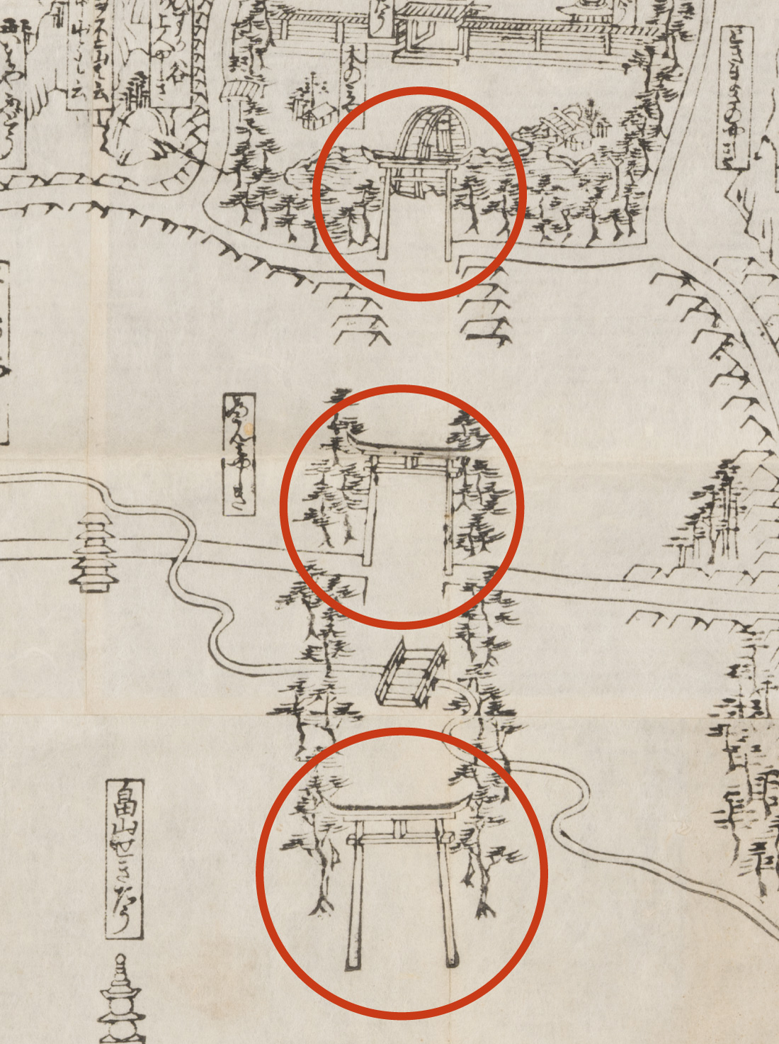 八幡宮から南側、由比ヶ浜に向かって目を移すと、図1には合計3つの鳥居が(図6)、図2は八幡宮入り口の鳥居が省略され2つの鳥居が(図7)描かれています。由比ヶ浜寄りの大鳥居は鶴岡八幡宮創建と同時に建てられたのち、台風・地震で幾度か再建されており、両図が描く鳥居が天文21(1552)年に北条氏康が修復したものか、寛文8(1668)年に修復されたものか判断するのは難しそうです。