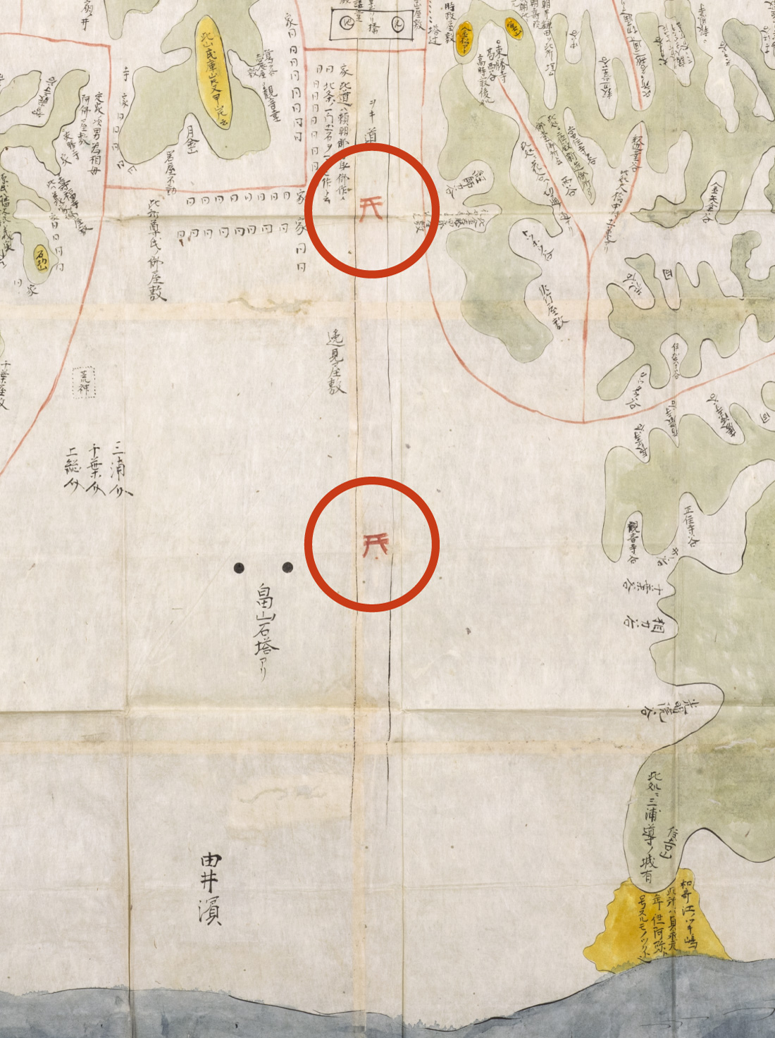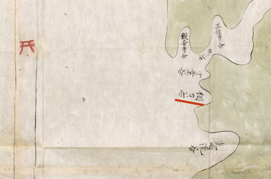 また、ふたつの図は鶴岡八幡宮周辺から海岸にかけた平地部分についてよりも、谷戸の起伏とその名称を細かく記している点も共通しています。