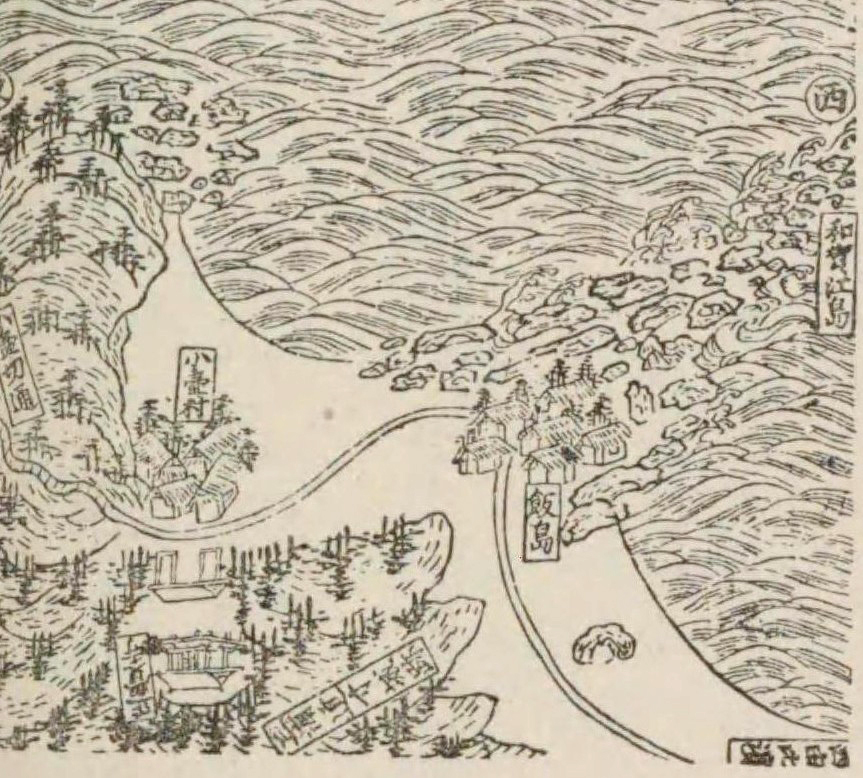 海岸の東側(向かって右)に目を転じると、いずれの図にも中世の港として栄えた人工島・和賀江島周辺について記されている箇所を見つけることができます。図1が「いわ井じま(飯島)/貞永元年ニつく也」と注記して島内に建物の絵を描く一方(図8)、図2は浜を区切って「和竒江ノツキ嶋、此所ハ貞永元年往阿弥ト号スルモノツクト也」と記します(図9)。飯島は和賀江島が岸に連なる場所の古い地名であり、天保年間(1830~44)に纏められた近世の地誌には和賀江島について「今はもう飯島崎とよばれる」(「今は里人飯島崎と云ふ」、『新編鎌倉志』・図10)と整理されていることから、いずれの図も記載内容に誤りはありません。ただし、地形を理解したうえで図示したかについては疑問が残るところです。