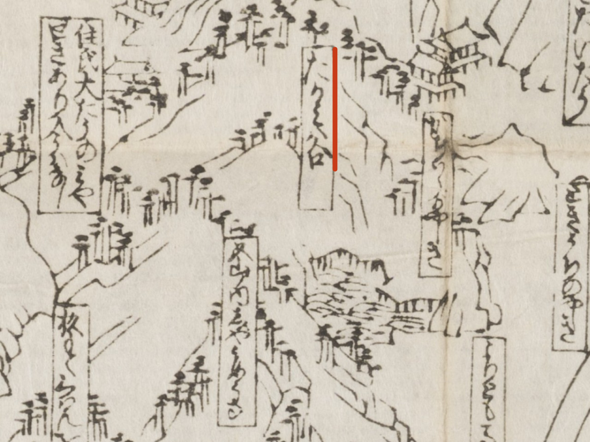 ふたつの「相州鎌倉之図」に共通するのは、どちらも地名の誤記が多数認められることです。図1は浄明寺付近の「くるみが谷」を「たかみ谷」と書き誤り(図11)、図2は材木座の「桐が谷」を「相が谷」とする(図12)などの誤りが見られます。「くるみが谷」の「𛀬(く) 」を「𛁠(た)」、「𛃻(る)」を「𛀙(か)」と間違い、「桐」を「相」と間違ったところを見ると、地名を知らずに字形の似た字と書き間違えたと考えられるでしょう。