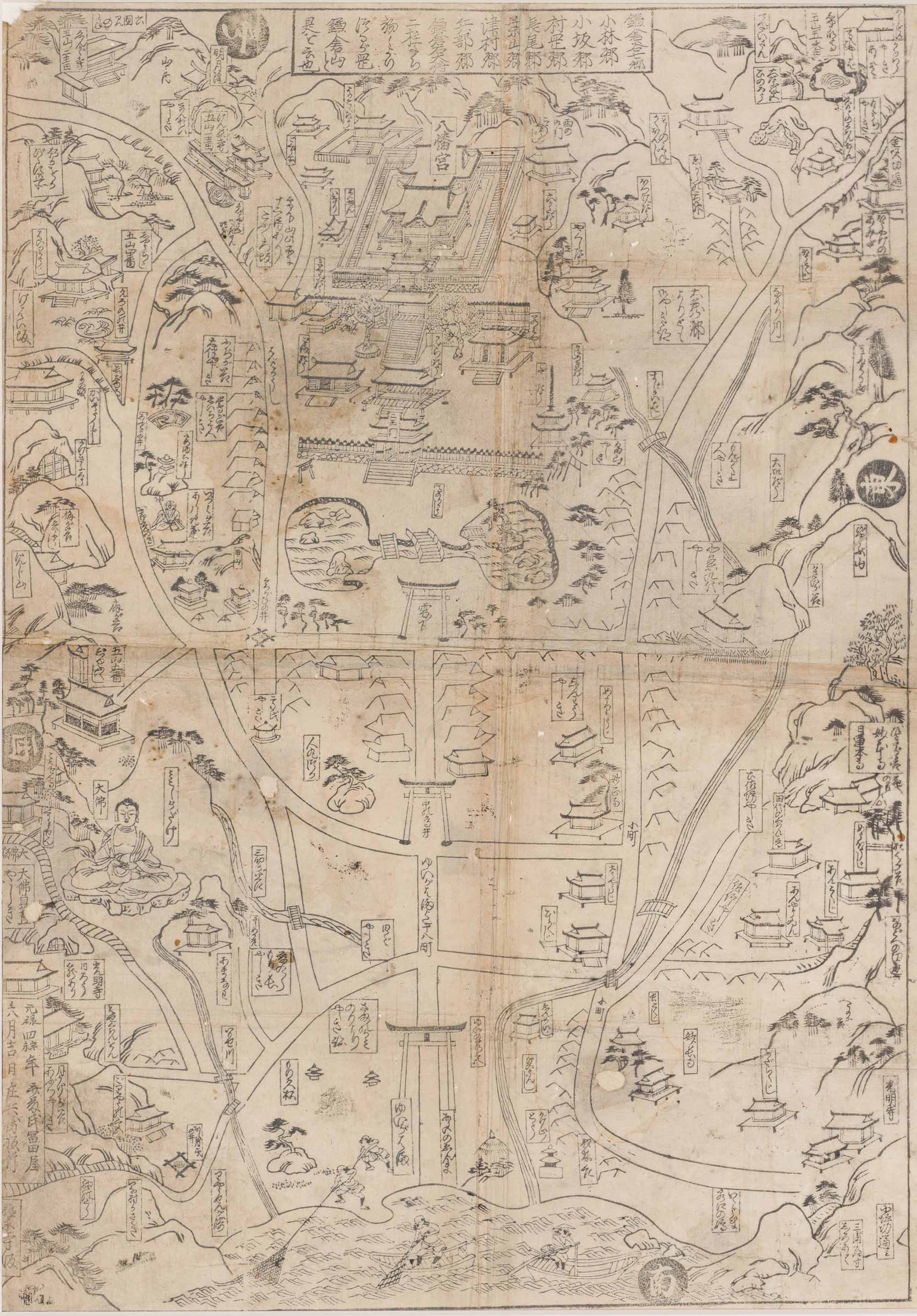 鎌倉絵図は、鶴岡八幡宮と若宮大路を中心に鎌倉周辺の名所をデフォルメ化して描いて人気を博し、木版刷りのものは万治(1658~)年間頃から近代まで50版以上刊行されました。本資料の図柄は、明暦・万治年間刊行の同名図を縮小・再編し、寛文・延宝年間に作成されたと考えられています。本資料の刷りはもっと新しいものかもしれませんが、図柄は鎌倉絵図の最初期のものといえます。版元は不明ですが、描かれた内容から鎌倉の版元ではなく、はやくから都市図を刊行していた江戸・大坂・京都の書肆(しょし)であろうと推測されます。