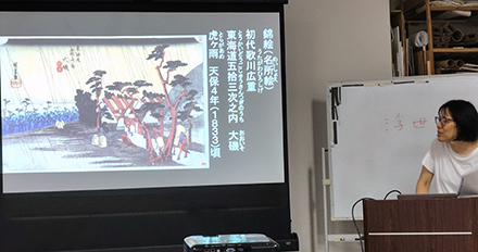 最初に、当館学芸員である桑山企画普及課長から浮世絵の歴史のほか、道中記や絵図などから神奈川県域の名所(観光地)についてレクチャーがあり、その後に藤澤浮世絵館で開催中の「浮世絵で訪ねる藤沢宿と江の島道 参詣と観光の歴史」をみんなで見学し、実物の浮世絵を見ながらクイズに挑戦したり、描かれた風景の特徴や違いなど、楽しみながら鑑賞しました。