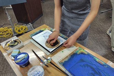 そして最後は、この講座のメインイベントでもある浮世絵の摺りに挑戦しました。まず藤澤浮世絵館の学芸員である益田亮助さんに、版木への色付け方法からばれんの使い方など基本的なことを実演で教わり、それから実際の摺りを体験しました。